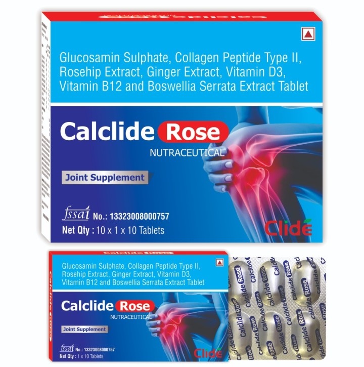 Calclide Rose ek advanced joint support formula hai jo natural extracts aur zaroori nutrients ka ek powerful blend hai. Isme Glucosamine, Collagen Peptide Type II, aur Rosehip Extract jaise tatva hain jo joints ki flexibility badhane aur dard kam karne mein madad karte hain. Yeh tablets cartilage ki repair aur inflammation (soojan) ko kam karne ke liye banayi gayi hain, taaki aapki mobility bani rahe.