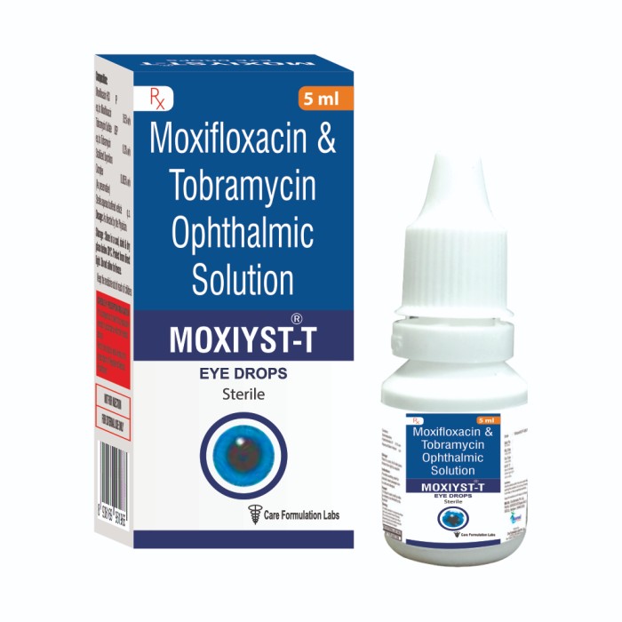 - MOXIFLOXACIN+TOBRAMYCIN belongs to ophthalmic eye medications primarily used to treat bacterial eye infections. Conjunctivitis (pink eye) is a common bacterial infection associated with the inflammation or infection of the conjunctiva (white part of the eye) and the inner eyelid.