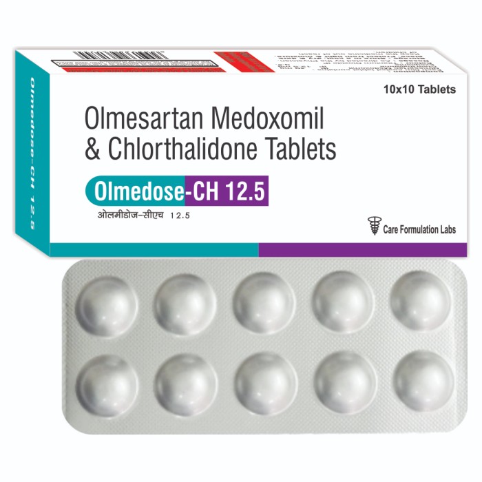 - OLMESARTAN MEDOXOMIL+CHLORTHALIDONE is used to treat hypertension, where Olmesartan medoxomil works by relaxing the blood vessels. On the other hand, Chlorthalidone being diuretic works by increasing the amount of urine that is passed out from the kidneys and hence lowering the blood pressure.