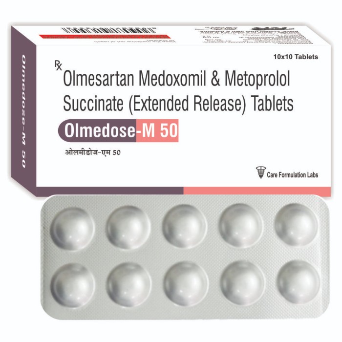 - OLMESARTAN+METOPROLOL is a combination of two medicines, namely Olmesartan and Metoprolol, which together help in lowering raised blood pressure effectively. Olmesartan is an angiotensin receptor blocker (ARB). It works by blocking the hormone angiotensin, thereby relaxing blood vessels.