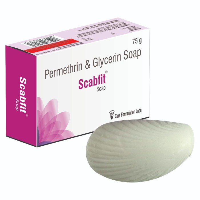 - Scabfit 1% Soap is a medicated soap that contains Permethrin. It is used to treat scabies (a contagious itchy skin condition caused by mites). It also kills head lice. This medicine kills the mites and their eggs and cures the infection.