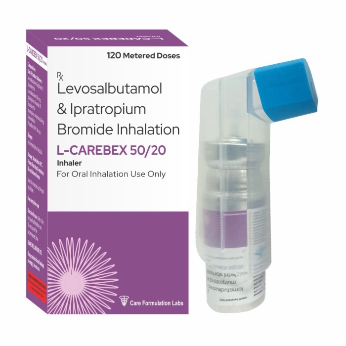 - Composition :Each Actuation Delivers : Levosalbutamol Sulphate IP Equivalent to Levosalbutamol 50mcg + Ipratropium Bromide IP equivalent to Ipratropium anhydrous 20mcg Suspended In propellent HFA 134a q.s.