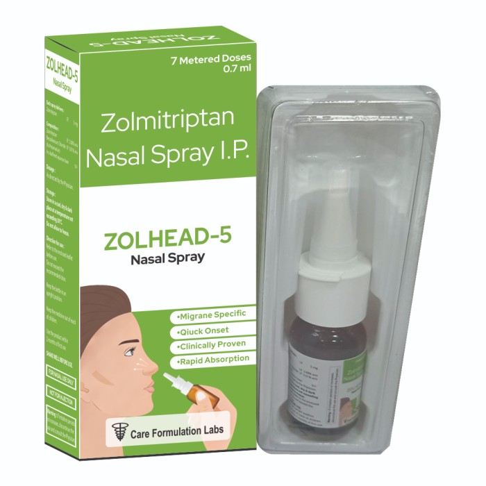 Composition : Zolmitriptan IP 5.00% w/v + Benzalkonium Chloride IP 0.01% w/v (as preservative) in a buffered aqueous base q.s.